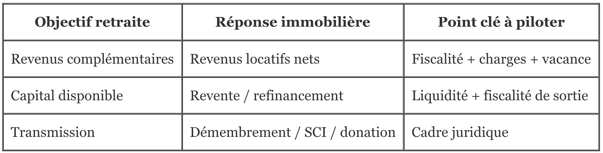 La clé, dans tous les cas, est la même : raisonner en net après impôt, intégrer les charges et la vacance, anticiper les travaux, et garder une stratégie de sortie cohérente. L’immobilier peut être un excellent outil de préparation à la retraite, à condition de le piloter comme un projet patrimonial complet, et pas comme un simple achat locatif.