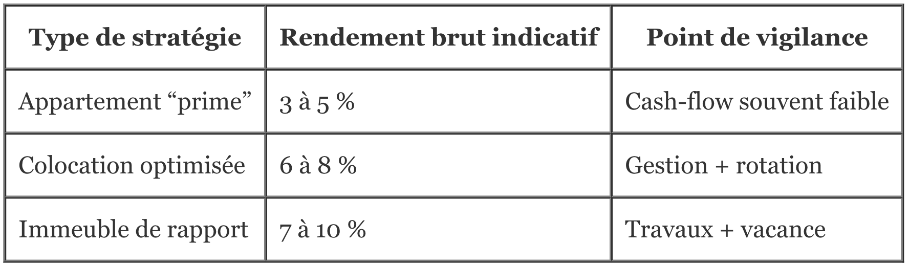 Pour une stratégie “patrimoine remboursé”, le rendement brut ne suffit pas. Ce qui compte, c’est la capacité du bien à tenir dans le temps une exploitation saine : charges raisonnables, entretien gérable, et fiscalité optimisée. Un rendement brut de 5 % peut devenir médiocre si la taxe foncière, les charges non récupérables, la gestion, l’assurance loyers impayés et la vacance rognent le résultat.