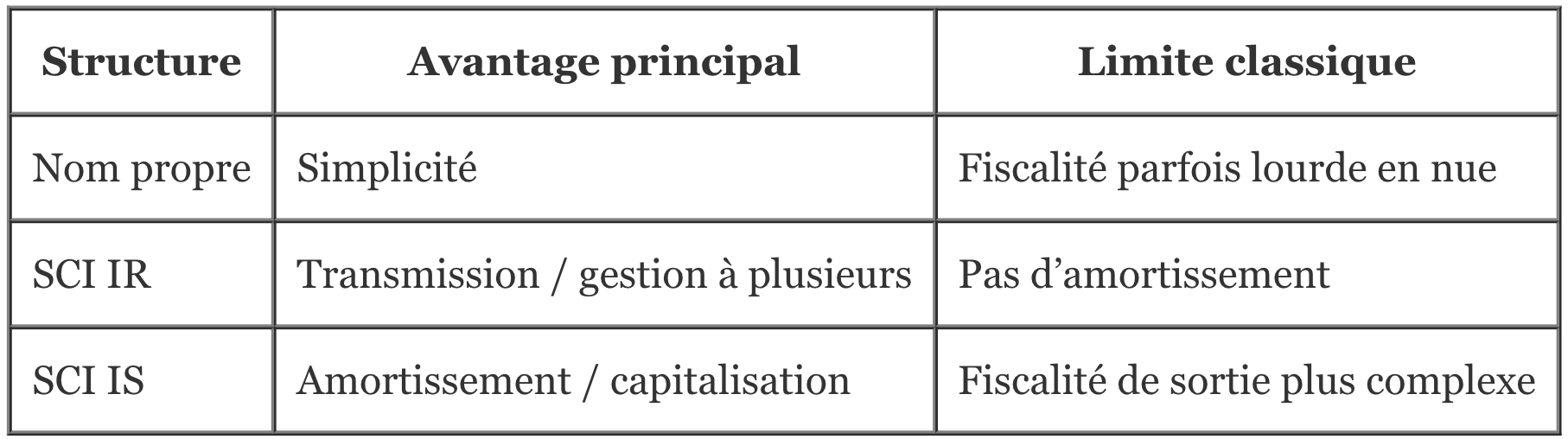 La troisième stratégie ne porte pas seulement sur “quoi acheter”, mais sur comment détenir. La structure de détention influence la fiscalité des loyers, la gouvernance, la transmission et parfois la capacité à réinvestir.